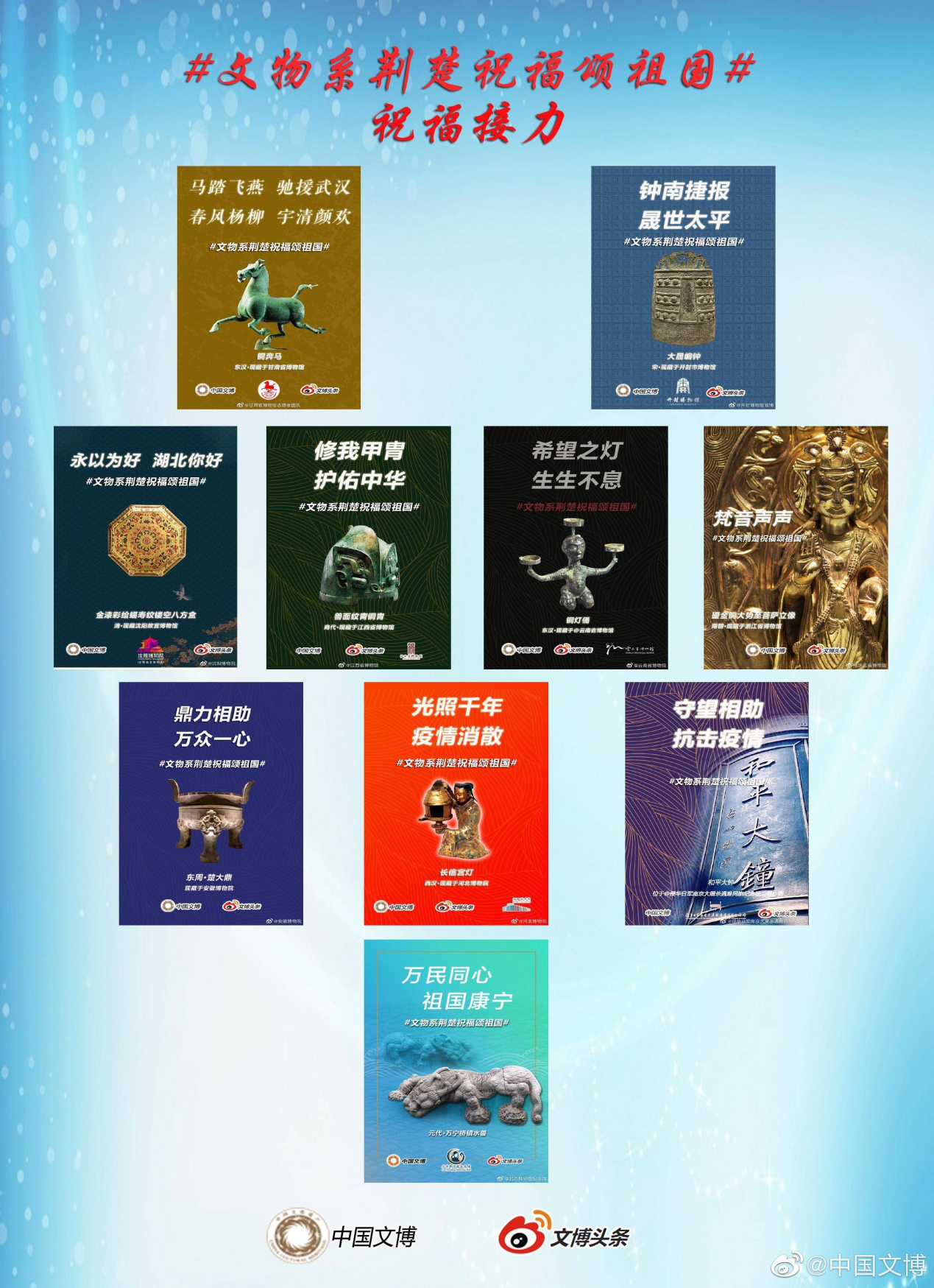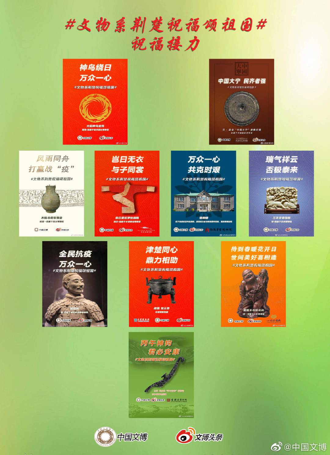 为落实国家文物局党组关于鼓励各地文物博物馆机构因地制宜开展线上展览展示工作的要求,国家文物局官方微博“中国文博”联合全国博物馆和文物考古遗址类官方账号组织开展“文物系荆楚祝福颂祖国”文物传递祝福接力活动,通过传播文物蕴含的历史价值、民族精神和文化力量,凝心聚力、提振精神,鼓舞各地特别是湖北省和武汉市抗击疫情的决心和士气,全力做好抗击疫情工作。