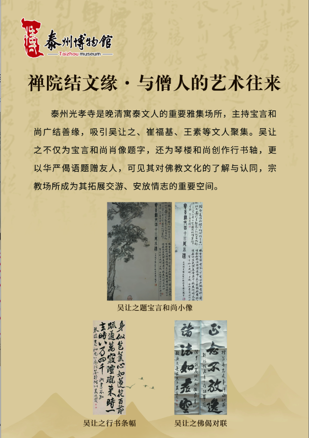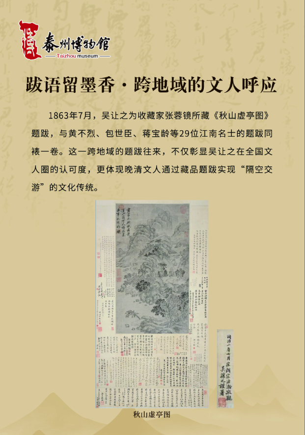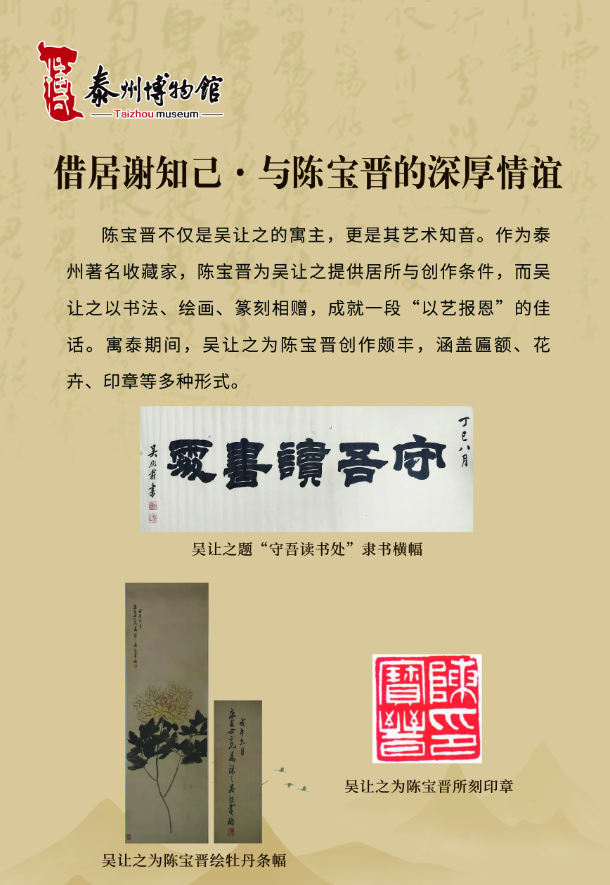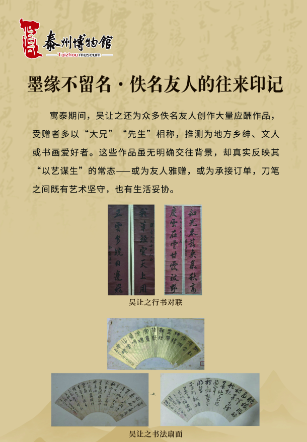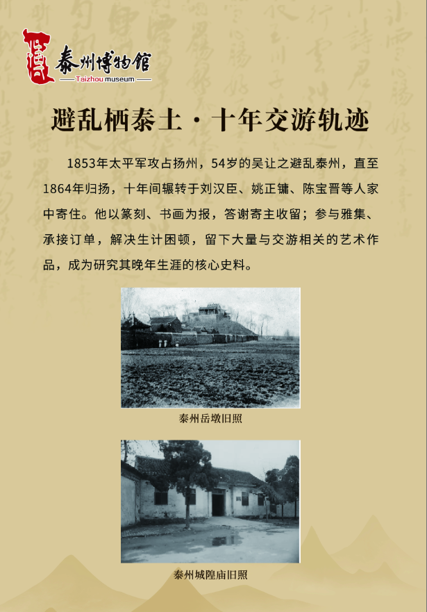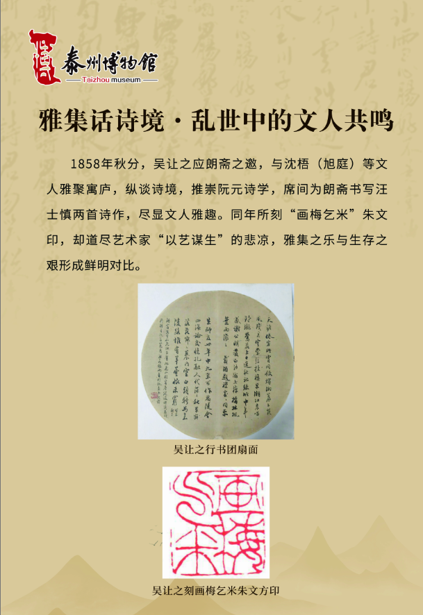 咸同年间,太平天国运动兴起,“泰以僻居内地,幸无恙”,泰州遂成为文人士大夫避乱聚居之地,诸多艺术家在此留下浓墨重彩的印记。吴让之便是寓泰群体中的核心代表,流寓泰州的十年,既是他艺术创作的黄金时期,亦是其历经生活困顿的岁月。